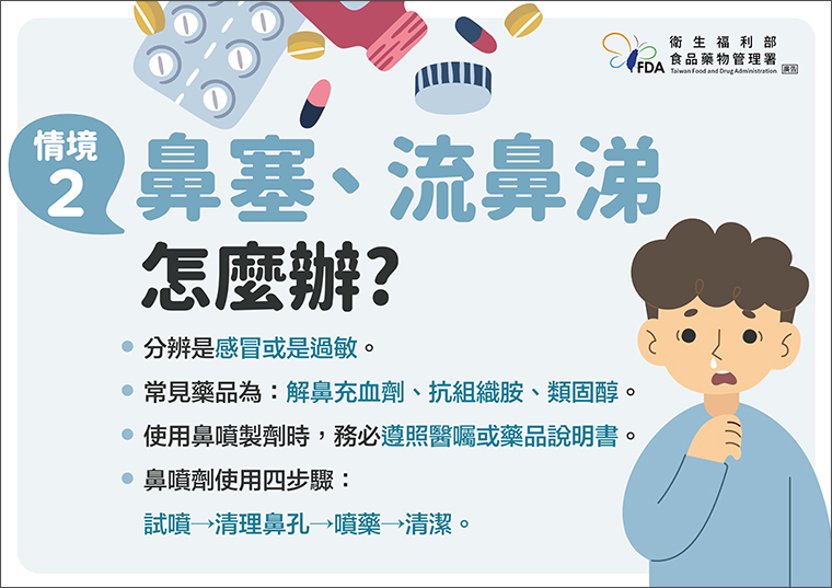 鼻塞、流鼻涕也是兒童常見感冒症狀,食藥署表示,家長應先分辨孩子是感冒或是過敏,常見藥品為解鼻充血劑、抗組織胺、類固醇,使用鼻噴製劑時,務必遵照醫囑或藥品說明書,而使用鼻噴劑時要注意4步驟「試噴、清理鼻孔、噴藥、清潔」。
