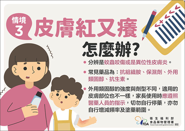當兒童皮膚又紅又癢時,家長又該如何處理呢?食藥署指出,應先分辨是蚊蟲咬傷或是異位性皮膚炎,在用藥方面常見藥品為,抗組織胺、保濕劑、外用類固醇、抗生素。值得注意的是,外用類固醇的強度與劑型不同,適用的皮膚部位也不一樣,家長使用時應遵照醫藥人員的指示,切勿自行停藥,亦勿自行增減頻率及塗藥範圍。