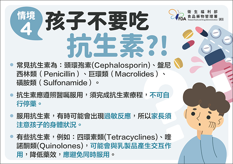 針對家長可能會疑惑,讓孩子服用抗生素究竟適不適合?食藥署解答,常見抗生素為頭環孢素(Cephalosporin)、盤尼西林類(Penicillin)、巨環類(Macrolides)、磺胺類(Sulfonamide),抗生素應遵照醫囑服用,須完成抗生素療程,不可自行停藥。而服用抗生素,可能會出現過敏反應,所以家長須注意孩子的身體狀況,同時得留意有些抗生素如四環素類(Tetracyclines)、喹諾酮類(Quinolones),可能會與乳製品產生交互作用,降低藥效,應避免同時服用。
