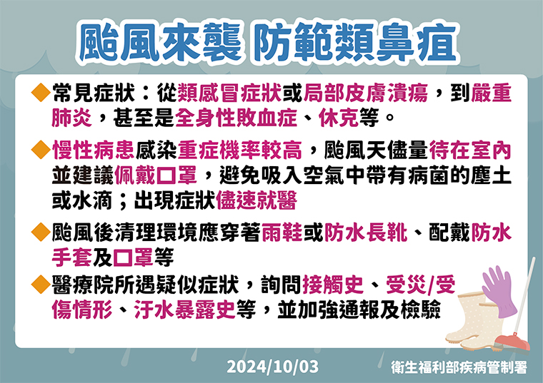疾管署呼籲,颱風過後為類鼻疽疫情高峰,民眾應做好個人防護措施,避免皮膚、傷口直接接觸或吸入受汙染塵土、土壤及汙水,降低感染機會。如出現疑似症狀時,尤其高風險族群,應儘速就醫並告知汙水、汙泥相關暴露史,以及早診斷獲得妥善治療;醫師診療遇有疑似個案,應儘速評估給予抗生素治療並於24小時內通報及採檢送驗,以利衛生單位採取防治措施。