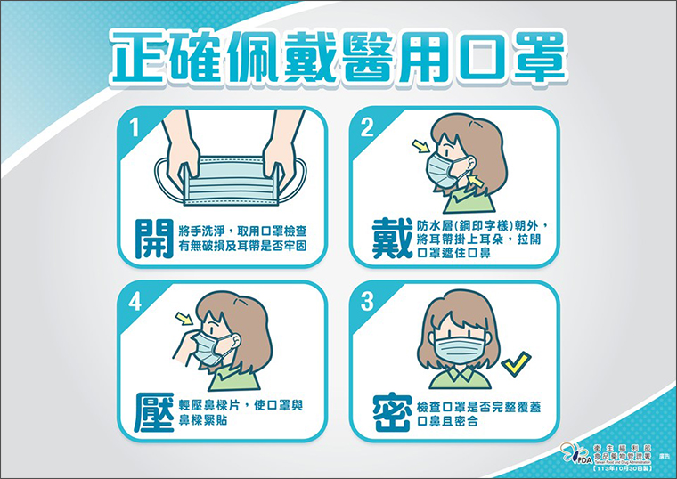 3.依照使用說明書正確佩戴:防水層朝外(通常是有色面,也可看鋼印字樣辨別),可用「開、戴、壓、密」口訣協助正確使用。