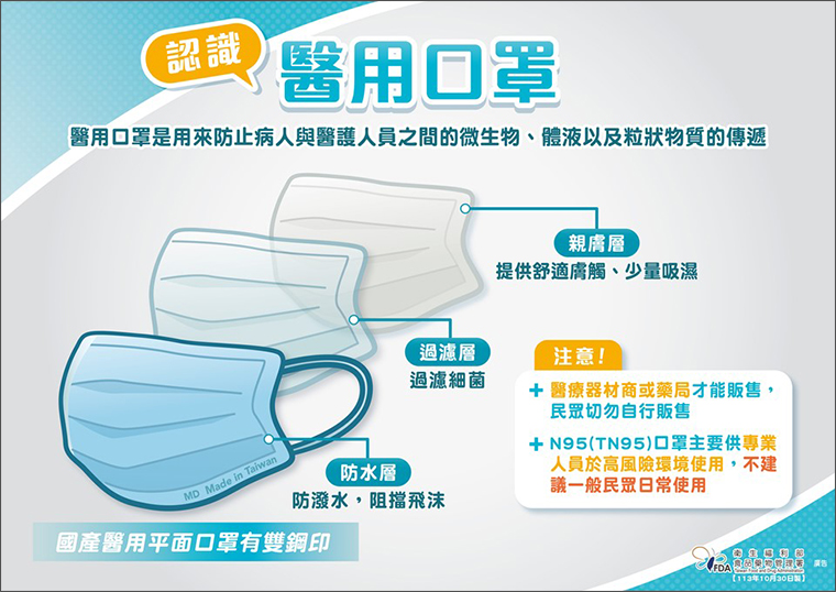 食藥署說明,常見的醫用口罩大多有3層結構,最外層有防撥水效果,可阻擋飛沫及異物,中間的過濾層可過濾細菌,裡面的親膚層則可少量吸收濕氣及水分,觸感較柔,使佩戴較為舒適。醫用口罩可以防止病人與醫護人員之間的微生物、體液以及粒狀物質的傳遞,須由合格的醫療器材製造業者製造,符合CNS 14774國家標準才能上市。