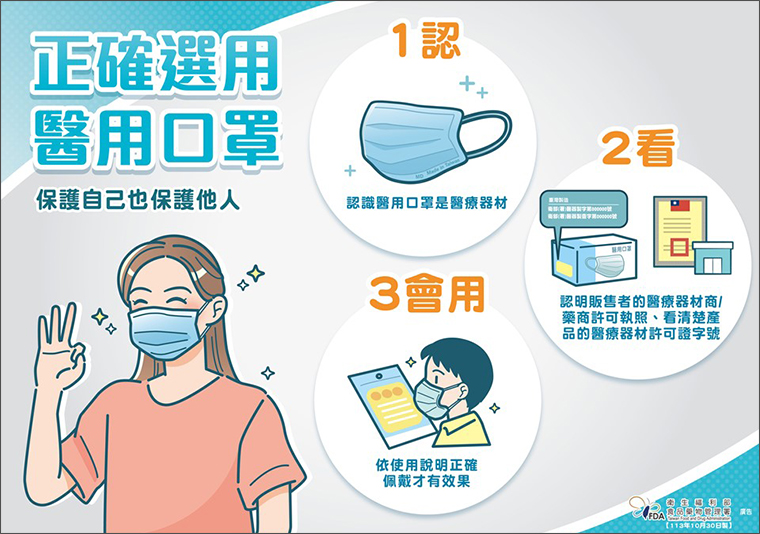 食藥署強調,消費者選用醫用口罩時應遵循1認、2看、3會用的原則,以保障產品效能及安全性: