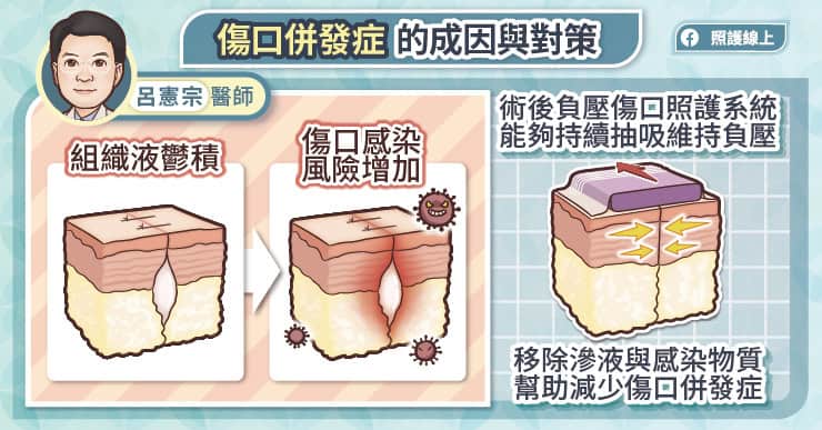 由於傷口中常會鬱積組織液,鬱積的組織液會增加傷口感染的風險。呂憲宗醫師說,手術後負壓傷口照護系統是在台灣是相對較新的技術,它是在傷口外覆蓋特殊海綿敷料,再以防水的薄膜固定,然後接上持續抽吸的主機。手術後負壓傷口照護系統能夠維持負壓,幫助移除滲液與感染物質,進而降低傷口感染的風險。