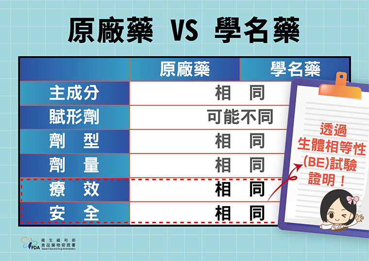 ▲學名藥與原廠藥在療效及安全性是相同的。(圖/食藥署提供)