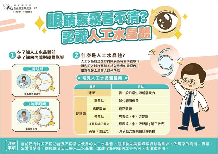 食藥署提醒,在接受人工水晶體置換手術前務必與眼科醫師充分溝通,依照需求選擇適合的人工水晶體,並遵守醫院提供之手術前、後注意事項。有關醫療器材相關資訊,除可向醫師詢問外,亦可至食藥署網站之許可證資料庫查詢產品之相關資訊(連結:食藥署首頁>醫療器材>資訊查詢>醫療器材許可證資料庫>西藥、醫療器材許可證相關查詢)。