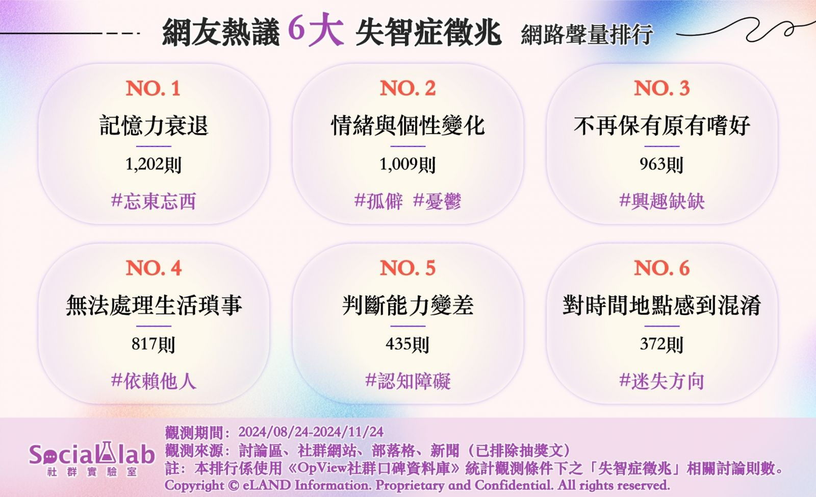 【NOW健康 翁靖祐/台北報導】失智症是一種會影響記憶、思考、判斷及日常生活能力的疾病。由於其初期徵兆如記憶力衰退、情緒起伏大等較不易察覺,常被誤以為是單純的「年老健忘」而遭到忽略,導致病情惡化,影響患者及其家人的生活品質。因此察覺那些細微但重要的徵兆,是幫助患者及早發現並做出應對、延緩失智症的關鍵。 《Social Lab社群實驗室》本次透過《OpView社群口碑資料庫》追蹤近3個月內「失智症徵兆」話題的網路聲量表現,帶您了解網友熱議的6大失智症徵兆。