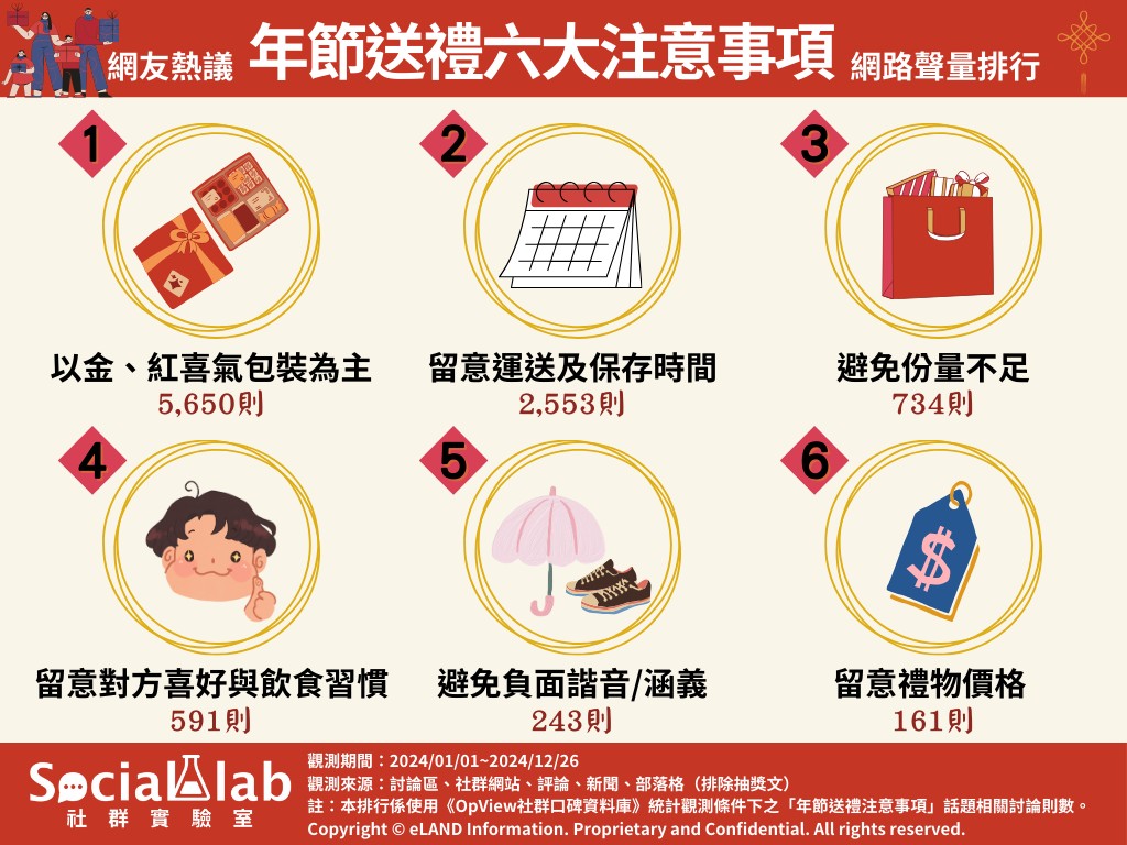【NOW健康 翁靖祐/台北報導】春節走春送禮,是華人文化中不可或缺的傳統習俗。無論是職場中的上司與合作夥伴,抑或生活中的親朋好友,都免不了要藉由禮品傳遞祝福與心意。然而,送禮對象的年齡、職業及喜好各不相同,究竟該如何挑選誠意滿滿又不失面子的禮物呢?就讓我們來一探最值得留意的年節送禮事項吧!《Social Lab社群實驗室》本次透過《OpView社群口碑資料庫》追蹤近一年「年節送禮注意事項」話題的網路聲量表現,帶您了解網友熱議的6大年節送禮注意事項。