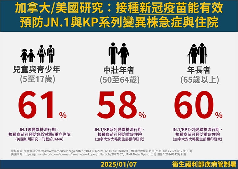 關於新冠疫苗保護效益方面,依據美國研究發現,在JN.1變異株流行期間,接種疫苗在兒童與青少年族群(5至17歲)族群,預防急診就醫與重症住院的保護效益為61%;而加拿大研究亦指出,在中壯年族群(50至64歲),接種疫苗在JN.1與KP系列變異株流行期間,預防重症住院保護效益為58%,針對年長者族群(65歲以上),預防重症住院的保護效益則可達60%。