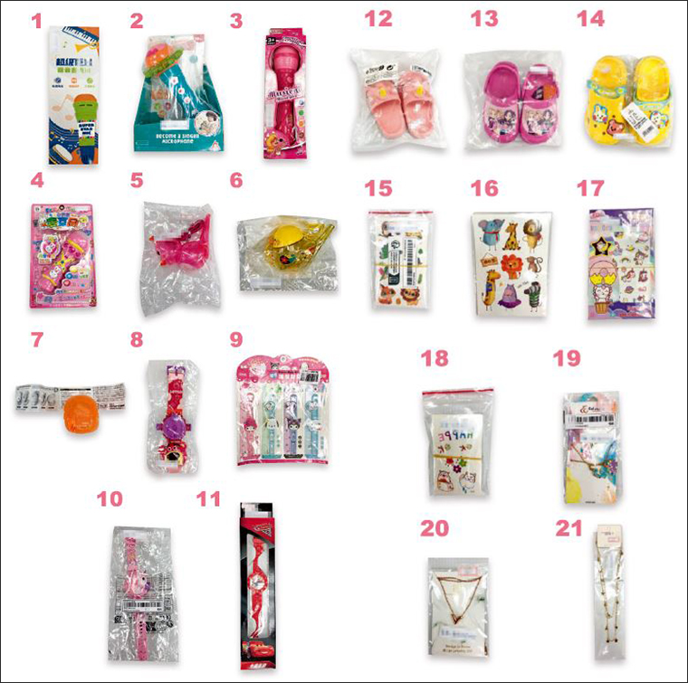 消基會說明,2024年7至8月於6家電商平臺(包括蝦皮購物、PChome、樂天市場、酷澎台灣網站、東森購物網等)購買共計21件兒童商品與飾品,其中有6件為玩具、5件為兒童手錶、3件為童鞋、4件為紋身貼紙,其餘3件都是飾品項鍊。