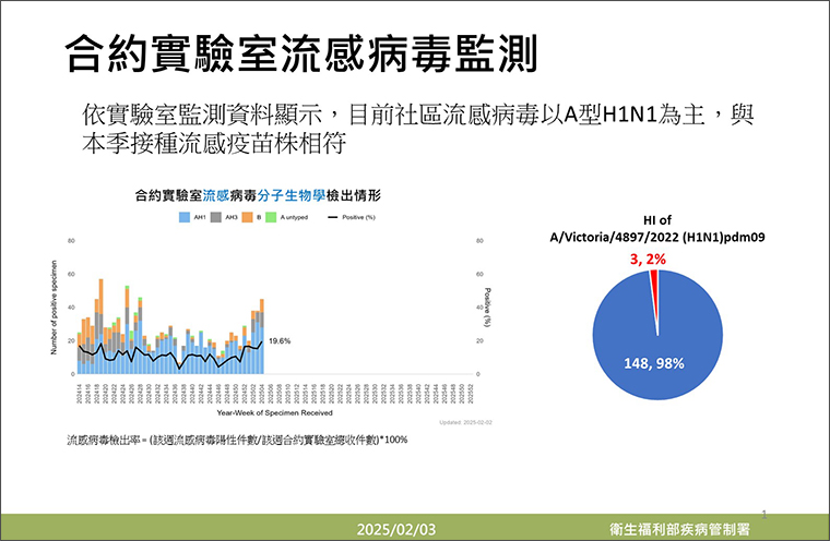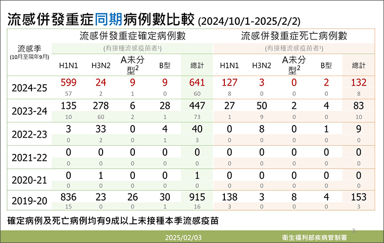 關於國內疫情狀況,依實驗室監測資料顯示,目前社區流感病毒以A型H1N1為主,與本季接種流感疫苗株相符。疾管署也指出,本流感季自2024年10月1日起截至2025年2月2日累計641例(599例H1N1、24例H3N2、9例A未分型、9例B型),年齡層以65歲以上長者為多(占54%),另死亡病例累計132例(127例H1N1、3例H3N2、2例B型),確定病例及死亡病例均有9成以上未接種本季流感疫苗。