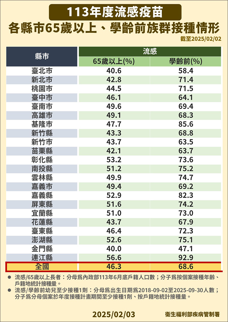 ▲113年流感疫苗各縣市65歲以上、學齡前族群接種情形。(圖/疾管署提供)