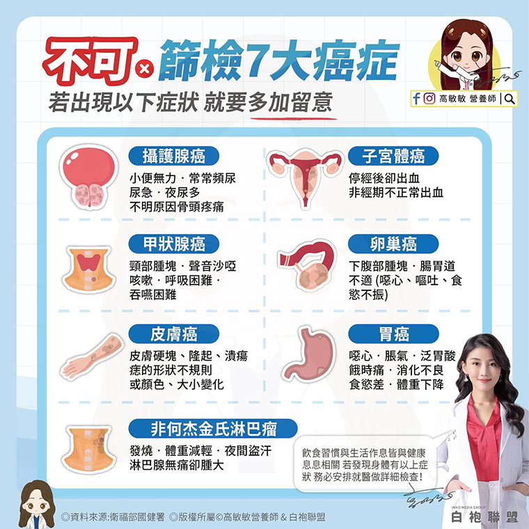 ▲營養師高敏敏示警,針對不可篩檢7大癌症,民眾要多留意身體病徵。(圖/擷取自「高敏敏營養師」臉書粉專)