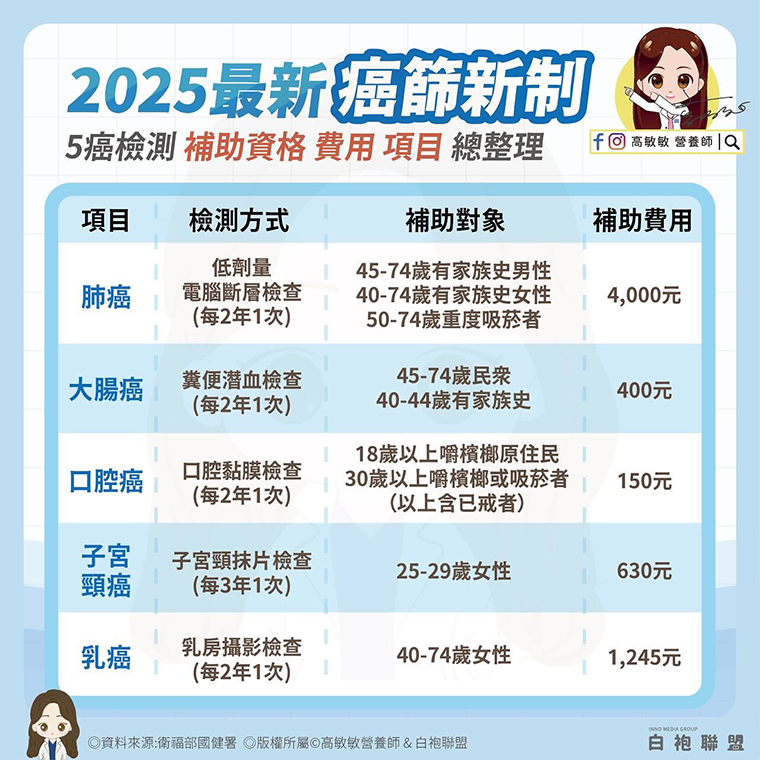 ▲2025最新癌篩新制上路,擴大補助資格,受益族群增加。(圖/擷取自「高敏敏營養師」臉書粉專)