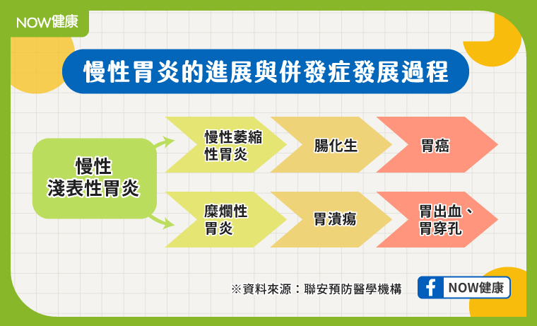 ▲慢性胃炎的進展與併發症發展過程。(資料來源/聯安預防醫學機構;圖/NOW健康製作)
