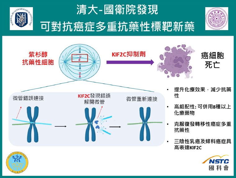 2017年起,清大教授王慧菁、孫玉珠等研究團隊透過臨床大數據結合分子技術,成功篩選出對抗三陰性乳癌化療抗藥性的全新治療標靶「驅動蛋白KIF2C」。王慧菁表示,KIF2C是一種微管解聚蛋白,負責修正染色體連接錯誤的微管,確保染色體正確分離,維持細胞基因體穩定。