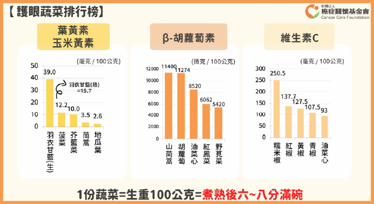 ▲徐佩瑜說,深綠色蔬菜有豐富多樣的營養素,不同營養素有不同功能,如:過濾藍光、抗氧化、預防乾眼症等都是食用深綠色蔬菜的好處。(圖/癌症關懷基金會提供)