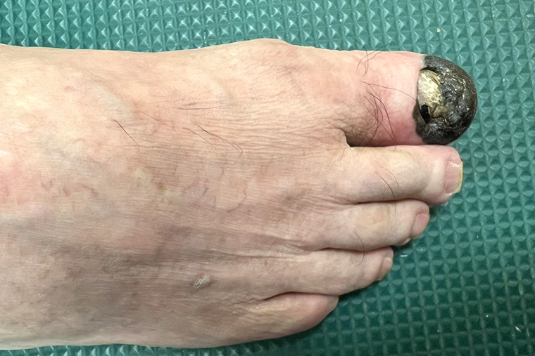 ▲個案林先生罹患的肢端黑色素瘤好發於肢體末端的位置,外觀呈現邊緣不規則且顏色不均的黑色斑塊,肉眼可見指甲已經因癌細胞破壞而變形。(圖/台北慈濟醫院提供)
