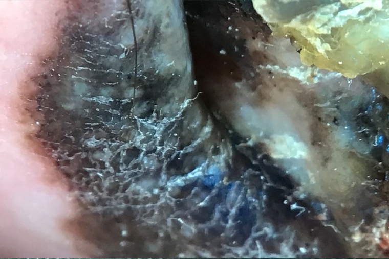 ▲在皮膚鏡高倍顯像下,惡性黑色素瘤的黑色素顏色深淺不一,腫瘤邊緣也呈現不規則狀。(圖/台北慈濟醫院提供)
