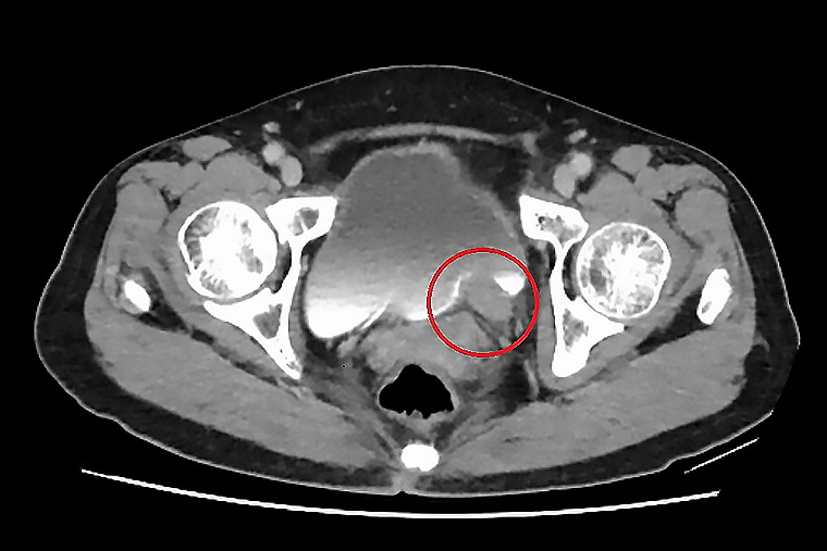 ▲電腦斷層顯示,左側輸尿管末端有一顆約5公分大腫瘤。(圖/台北慈濟醫院提供)