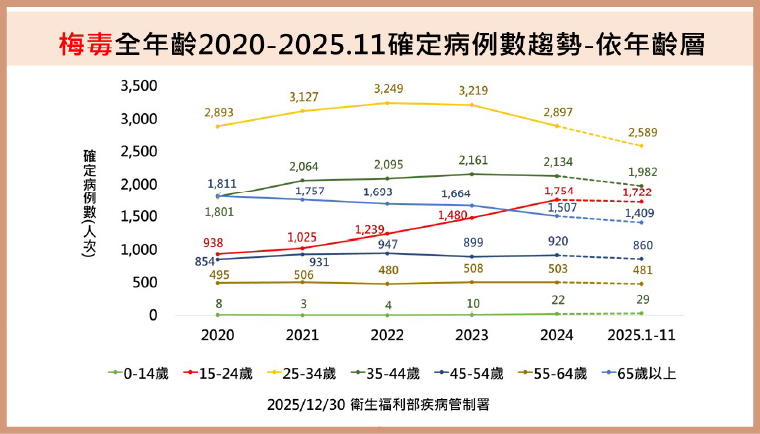 ▲梅毒全年齡2020至2025年11月確定病例數趨勢(依年齡層)。(圖/疾管署提供)