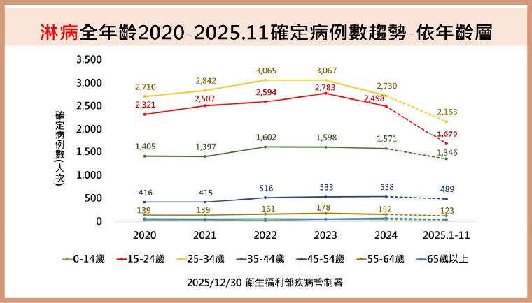 ▲淋病全年齡2020至2025年11月確定病例數趨勢(依年齡層)。(圖/疾管署提供)