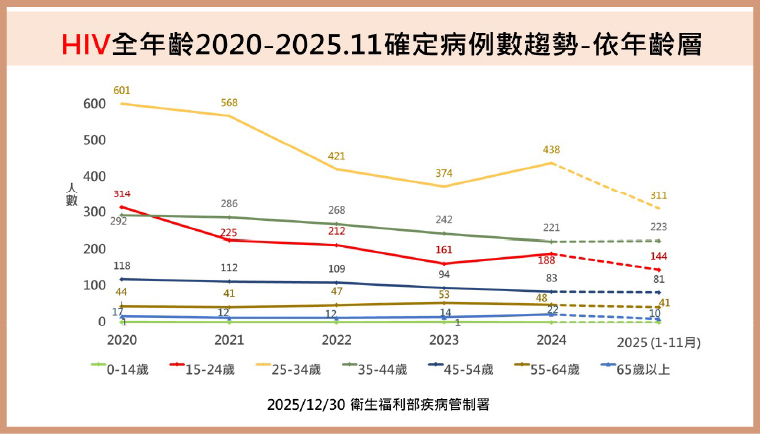 ▲HIV全年齡2020至2025年11月確定病例數趨勢(依年齡層)。(圖/疾管署提供)