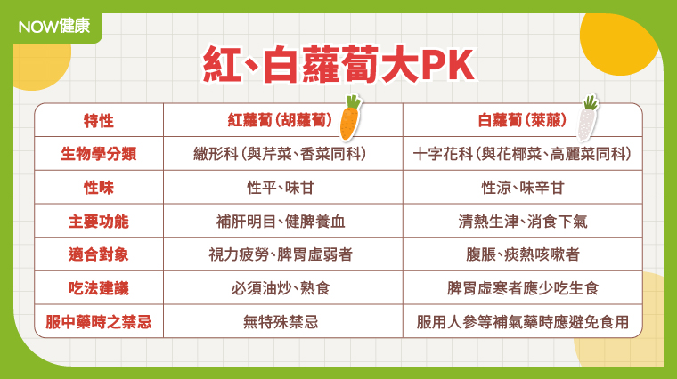 ▲紅蘿蔔甘平、補脾養血,建議熟食並添加油脂以利吸收;白蘿蔔辛涼、消食下氣,建議脾虛者少吃生食。(資料來源/林怡嫣中醫師;圖/NOW健康製作)